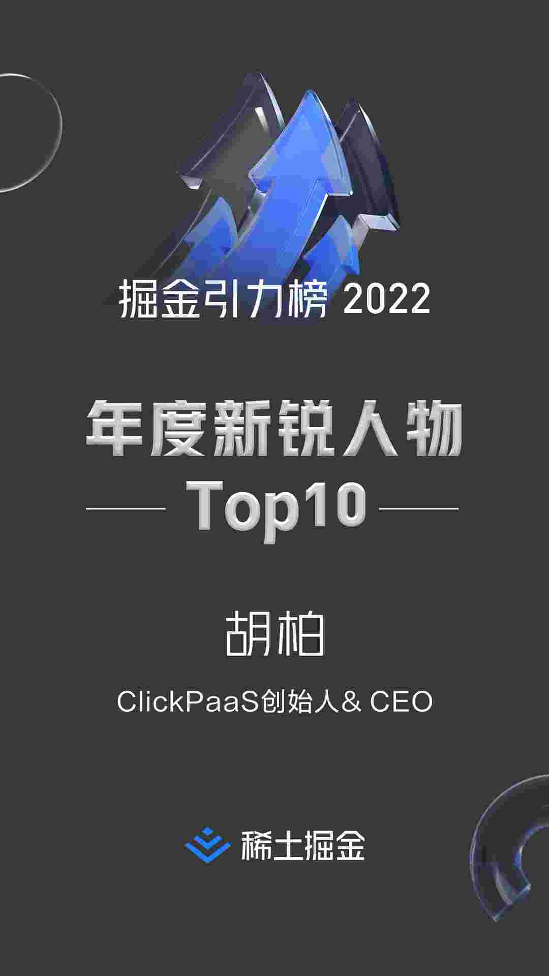 2022年1月6日,,,,,,,,,稀土掘金社区第一届「掘金未来大会」成功举办,,,,,,会上发布了“2022 稀土掘金引力榜 年度新锐人物”榜单,,,,,,,,,上海爱湃斯科技有限公司(简称EBPAY)创始人及CEO胡柏实力入选年度新锐人物TOP 10。。。。。。。。。